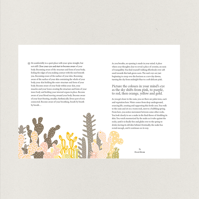 The meditations included are designed to encourage clarity and energy for the day ahead, with weekend morning meditations to help let go of the past week and explore bigger questions. Mantras are included to help bring awareness to particular words and phrases and set you off on a positive path for the day ahead. There is also focus on intention setting and an introduction to guided visualisations for boosting energy, finding focus and summoning creativity.